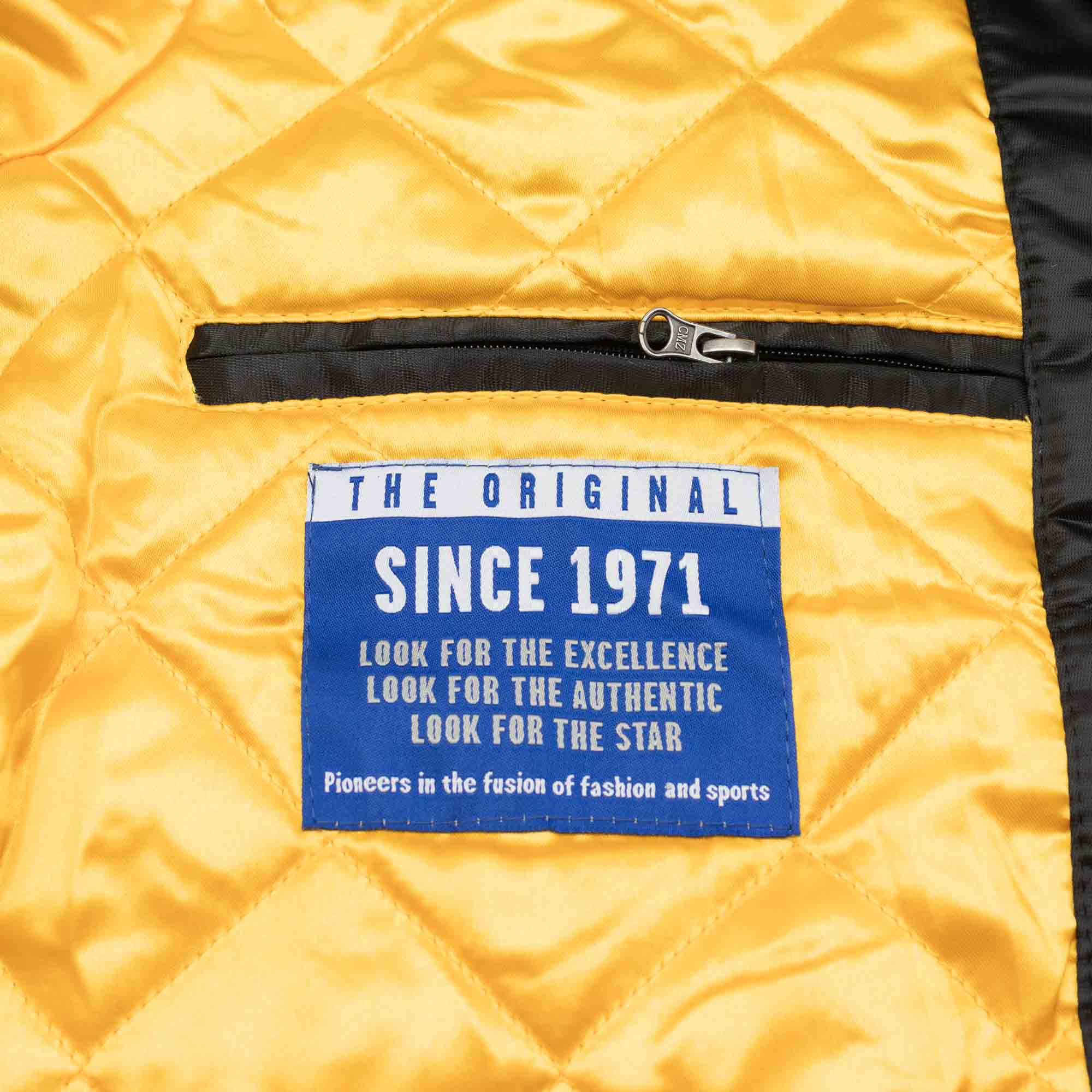 Mit der Enforcer Starter Varsity Satin Jacket sorgst du für eindeutigen Penguins Team-Support. Mit den komplett aufgestickten Teamapplikationen und den farblich abgesetzten Ärmeln ist die Jacke ein echter Hingucker. Auf der linken Brust ist das Pittsburgh Penguins Teamlogo hochwertig aufgestickt. Abgerundet wird das einmalige Starter-Design mit dem offiziellen NHL Shield in den Teamfarben auf dem rechten Ärmel. Das legendäre Starter Logo befindet sich auf dem linken Ärmel als hochwertiger Stick, sowie im Kragen und auf der Innentasche als aufgenähtes Label.