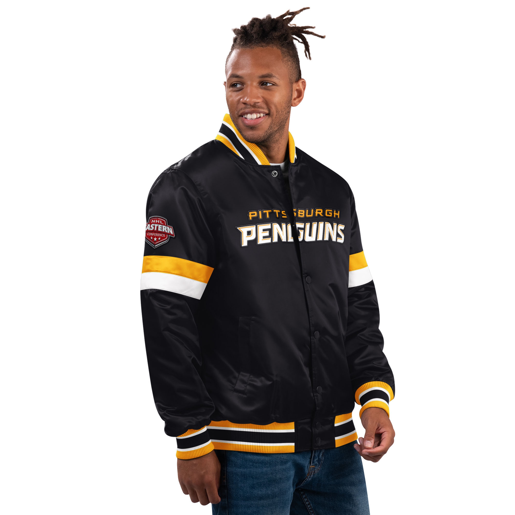 Starter NHL Herren Varsity Satin Jacke im Home Game Style deiner Pittsburgh Penguins.