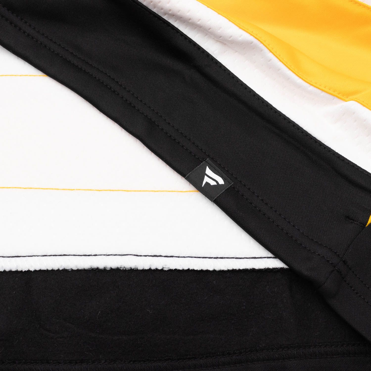 - Aufgenähte Streifen: Authentische, aufgenähte Streifen an Ärmeln und Bund im klassischen NHL-Jersey-Look.