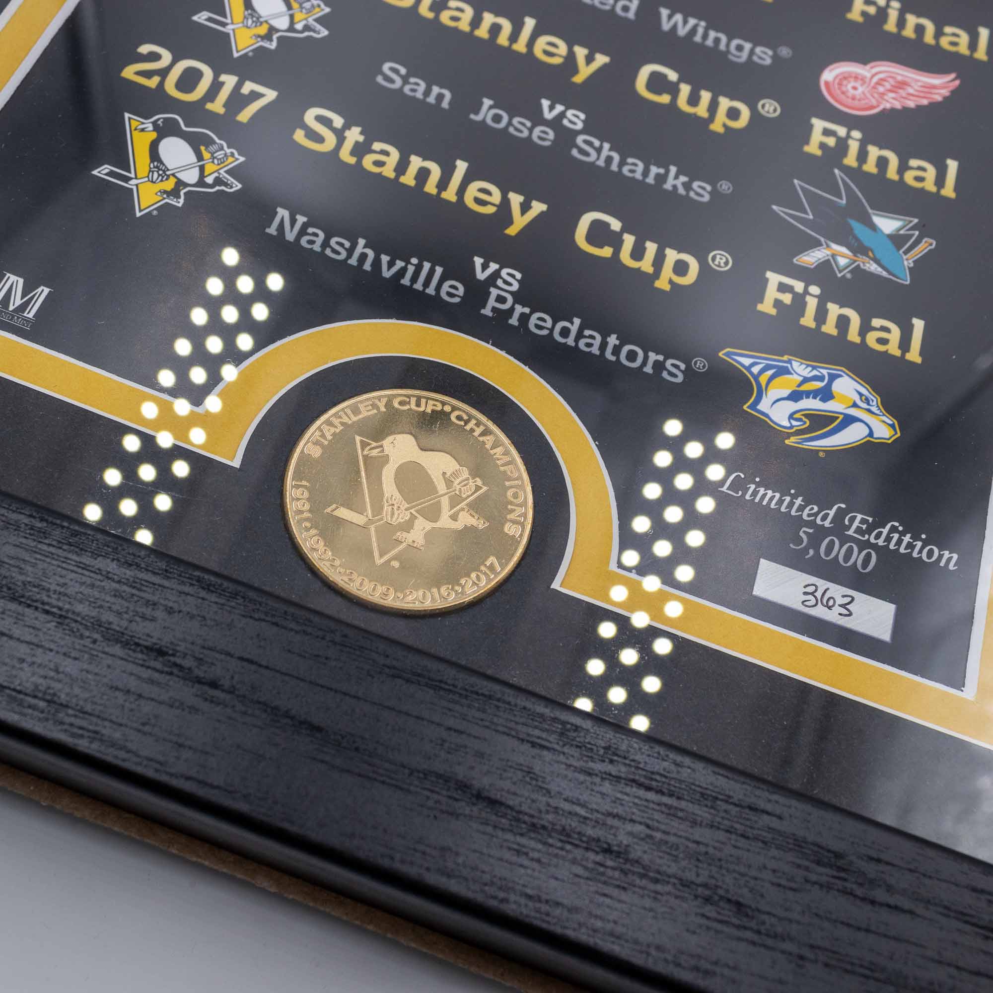 Eine limitierte Auflage zum Gedenken an den fünffachen Stanley-Cup-Sieger Pittsburgh Penguins! Dieser 30 x 50 cm große Rahmen mit doppelter Mattierung und einer Glasfrontplatte verfügt über ein individuell nummeriertes 38 x 17 cm großes Erinnerungsfoto, auf dem jeder ihrer Stanley Cup Championships aufgeführt ist, sowie eine geprägte 39-mm-Gedenkmünze aus massiver Bronze des Teams.