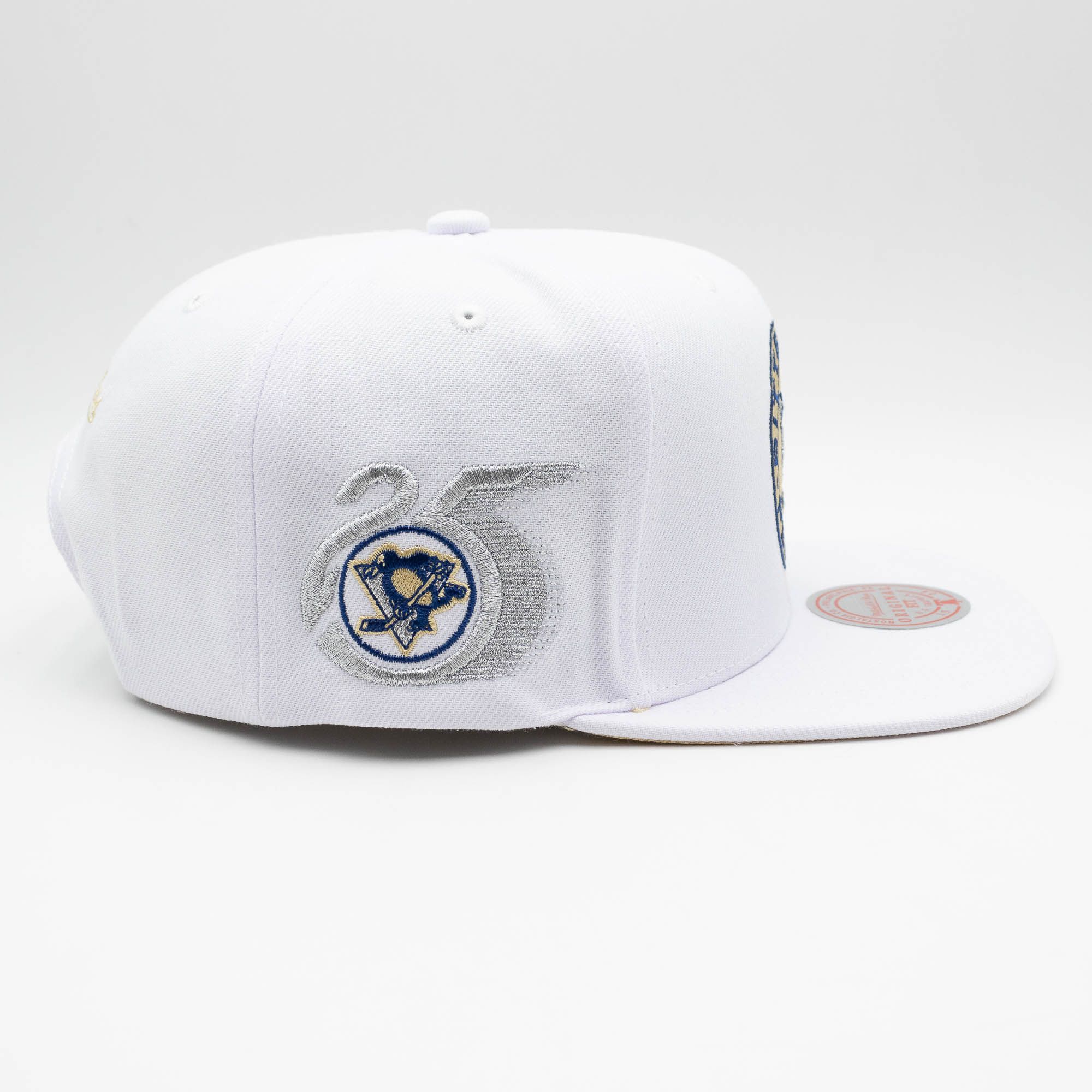 Mitchell & Ness NHL Original Fit Eishockey Snapback Cap von deinen Pittsburgh Penguins im weißen Winter White Design mit hochwertig aufgesticktem 25th Anniversary Side Patch.