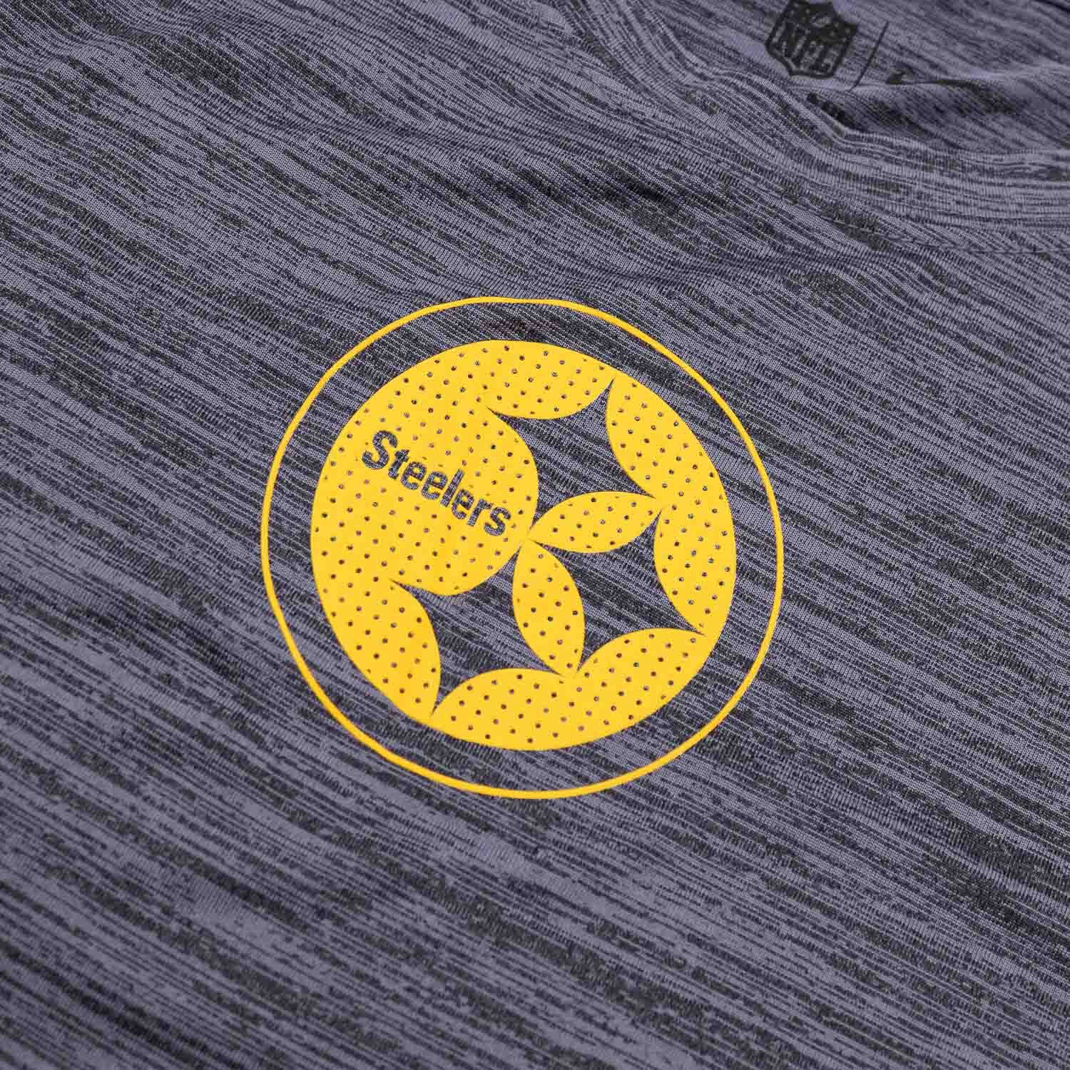 Auf der Vorderseite sitzt mittig das markante Steelers Teamlogo, ergänzt durch das NFL Shield auf dem rechten Ärmel und dem Nike Swoosh Logo auf dem linken. Gefertigt aus leichtem, weichem 100 % Performance-Polyester bietet das Shirt hervorragenden Tragekomfort.