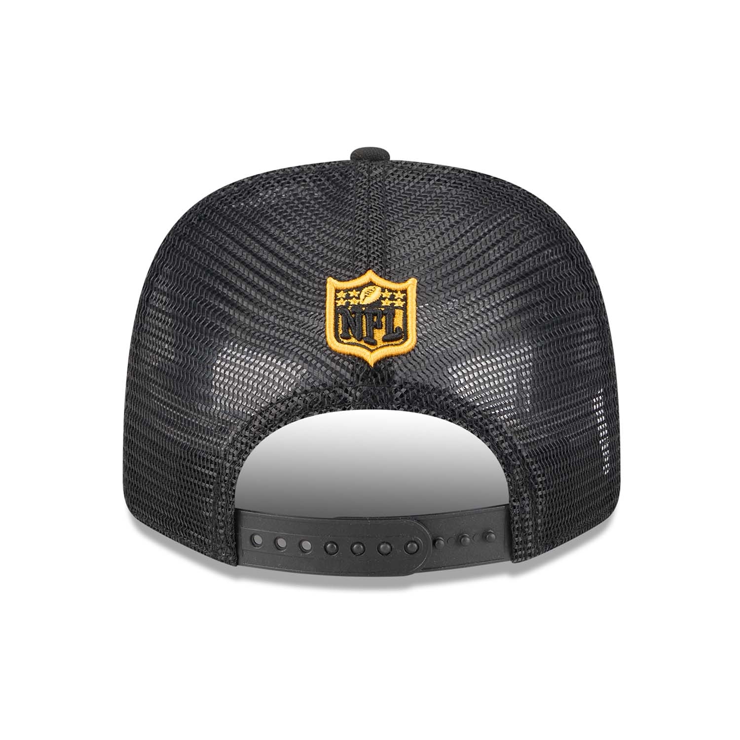 Offizielle Football-Cap der Pittsburgh Steelers mit hoher, fester Crown, gebogenem Visor und Trucker Meshback im schwarzen Teamdesign.