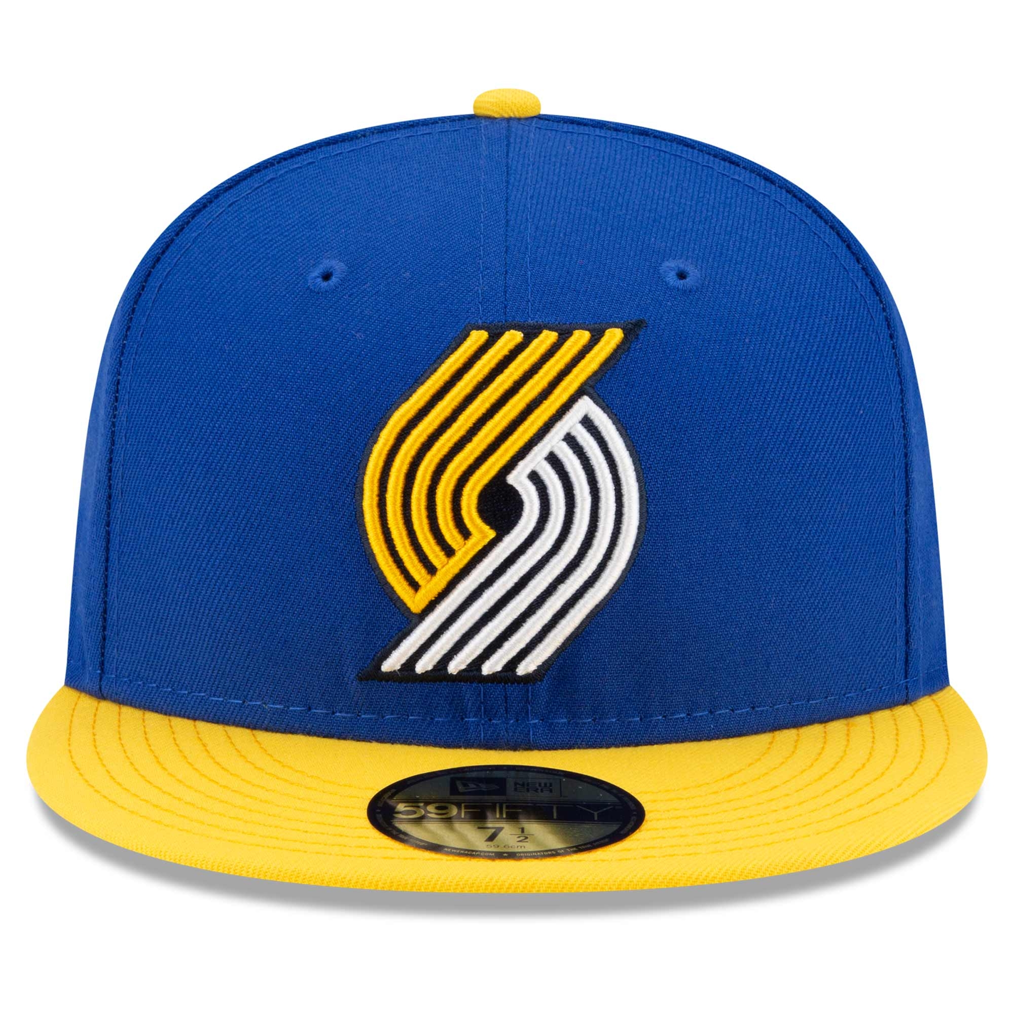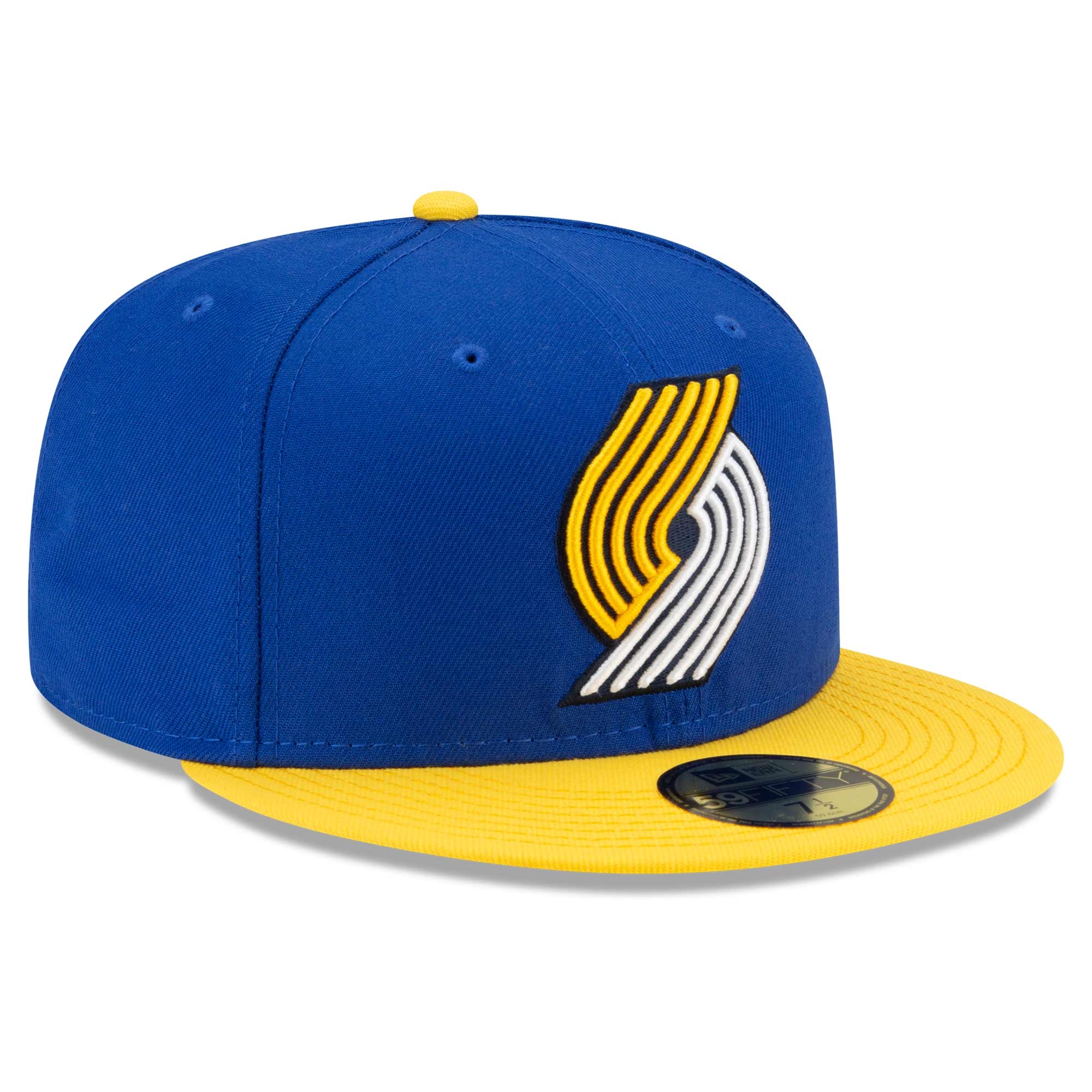 New Era Basketball 59FIFTY Fitted Cap von deinen Portland Trail Blazers aus der 2021 NBA Flash Kollektion im Blau-Gelben Colorpack Design.