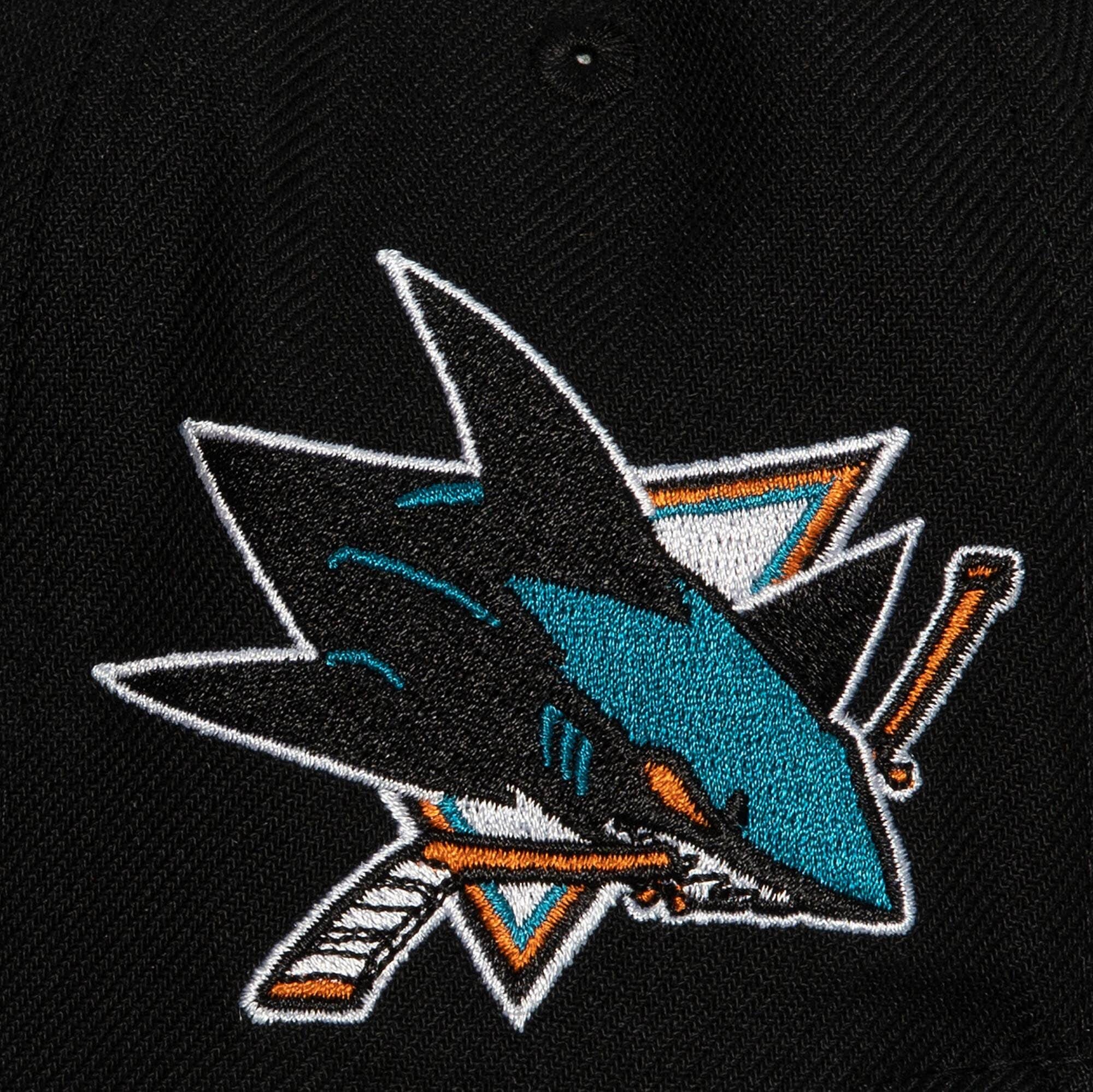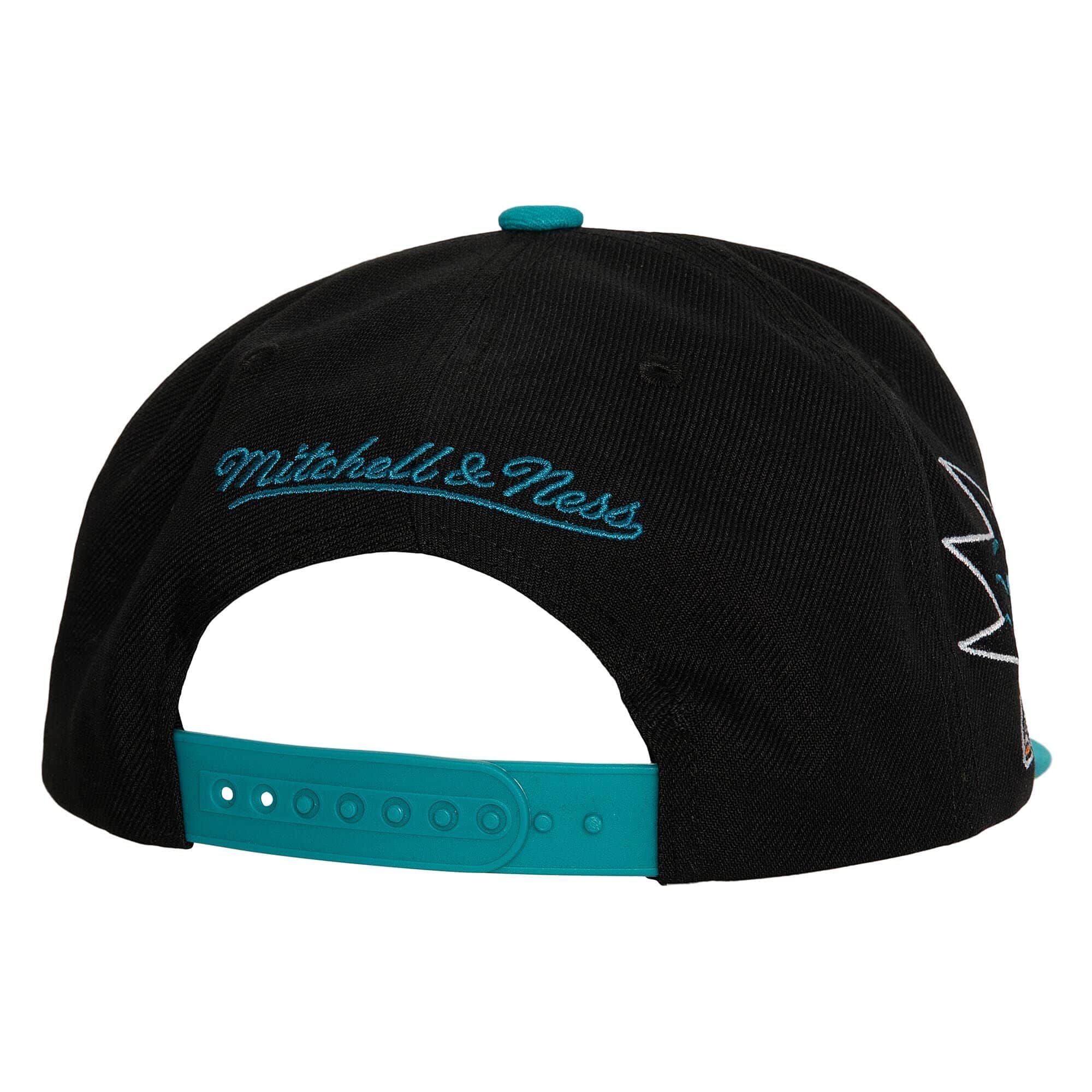 Mitchell & Ness NHL Original Fit Eishockey Snapback Cap von deinen San Jose Sharks im zweifarbigen Vintage Script Style.
