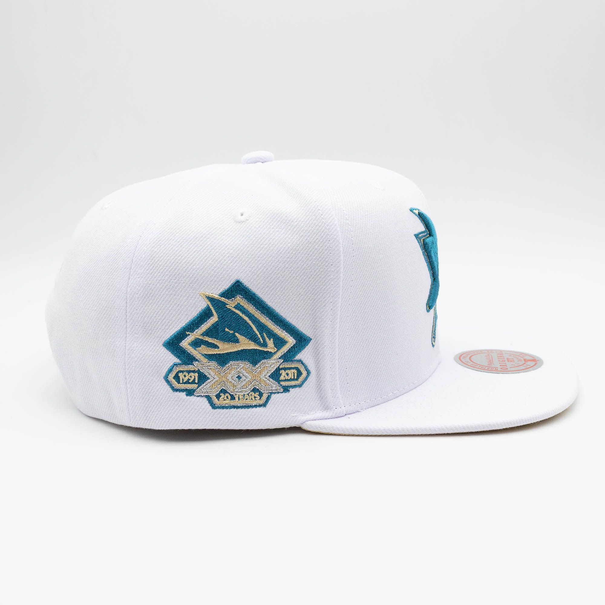 Mitchell & Ness NHL Original Fit Eishockey Snapback Cap von deinen San Jose Sharks im weißen Winter White Design mit hochwertig aufgesticktem 20th Anniversary Side Patch.
