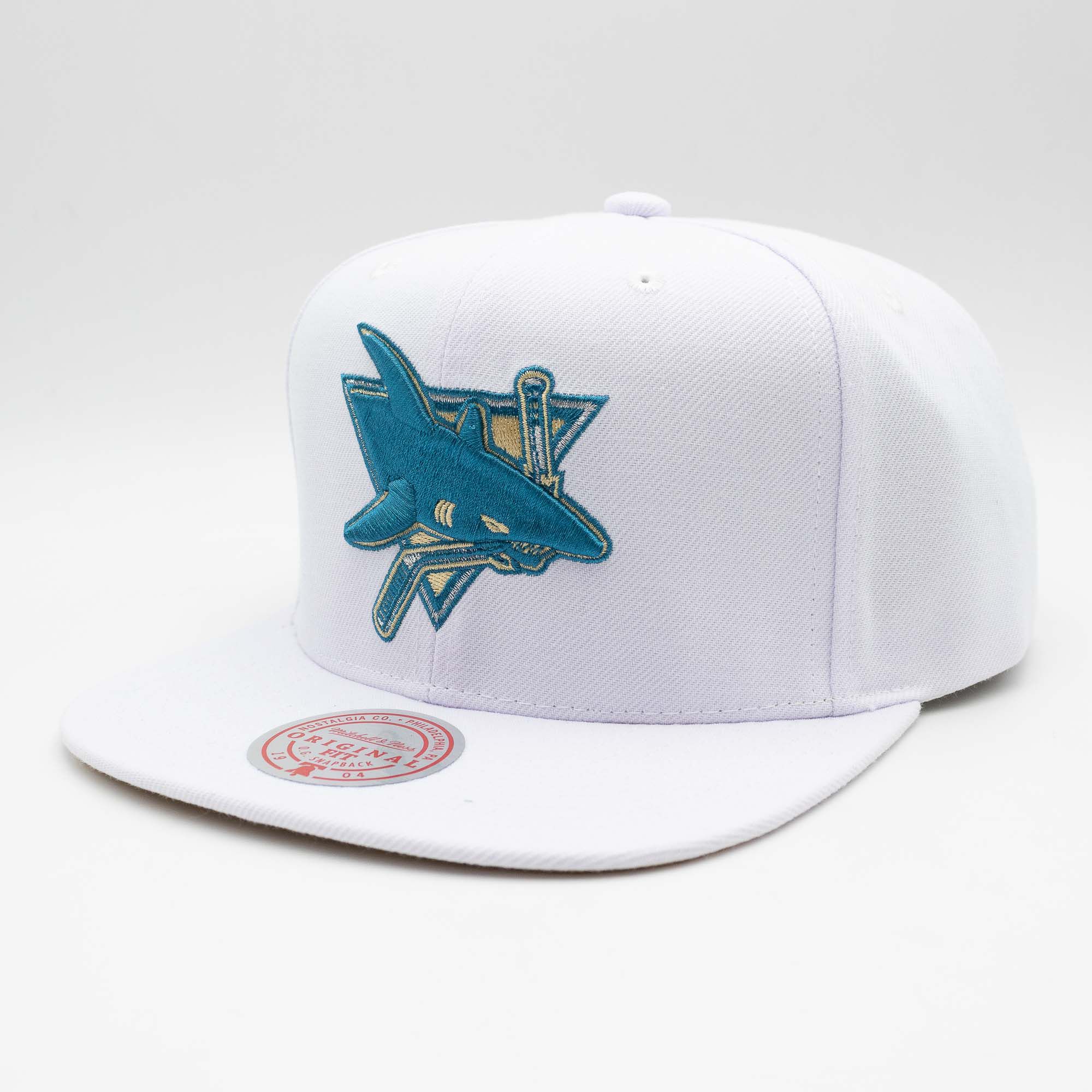 Mitchell & Ness NHL Original Fit Eishockey Snapback Cap von deinen San Jose Sharks im weißen Winter White Design mit hochwertig aufgesticktem Side Patch.