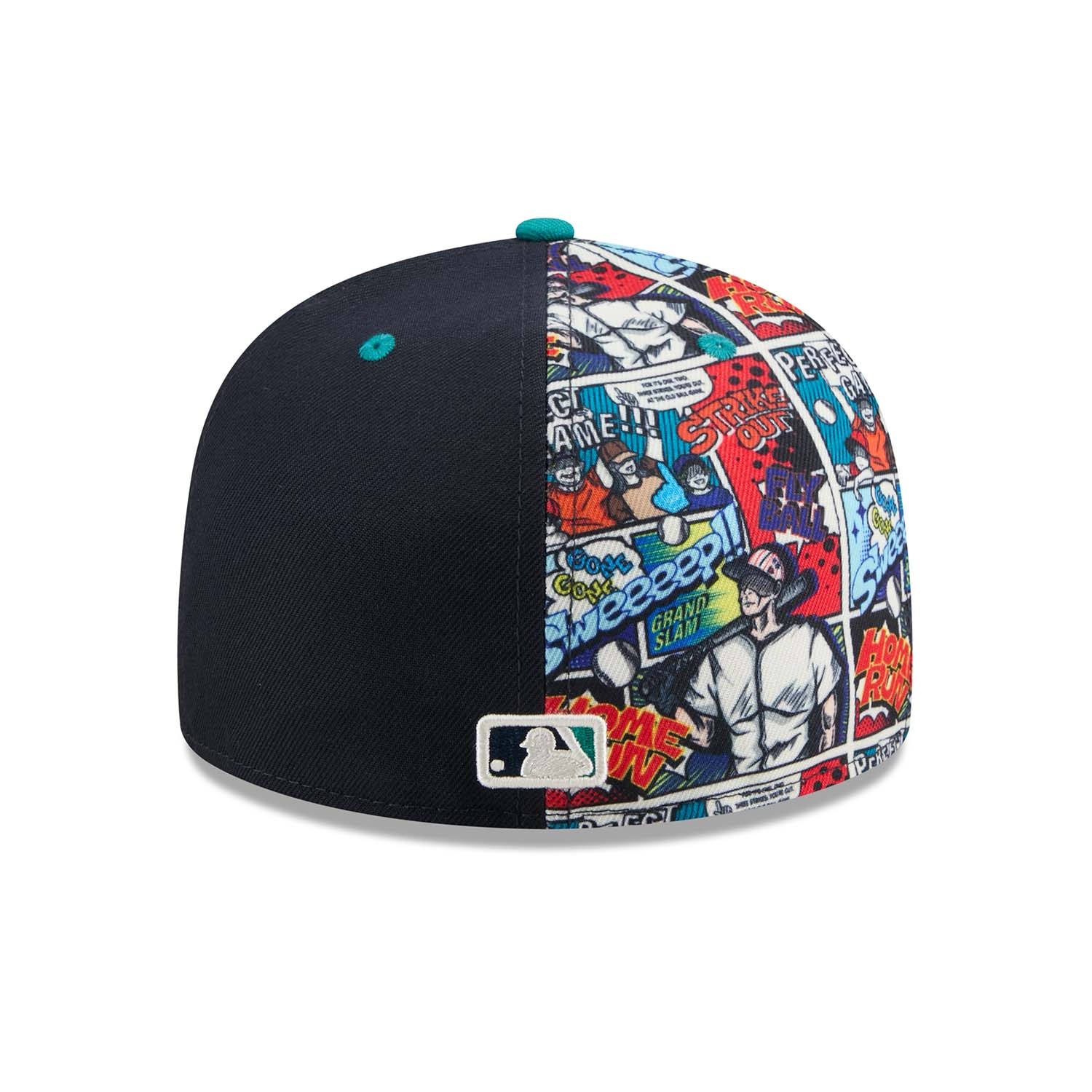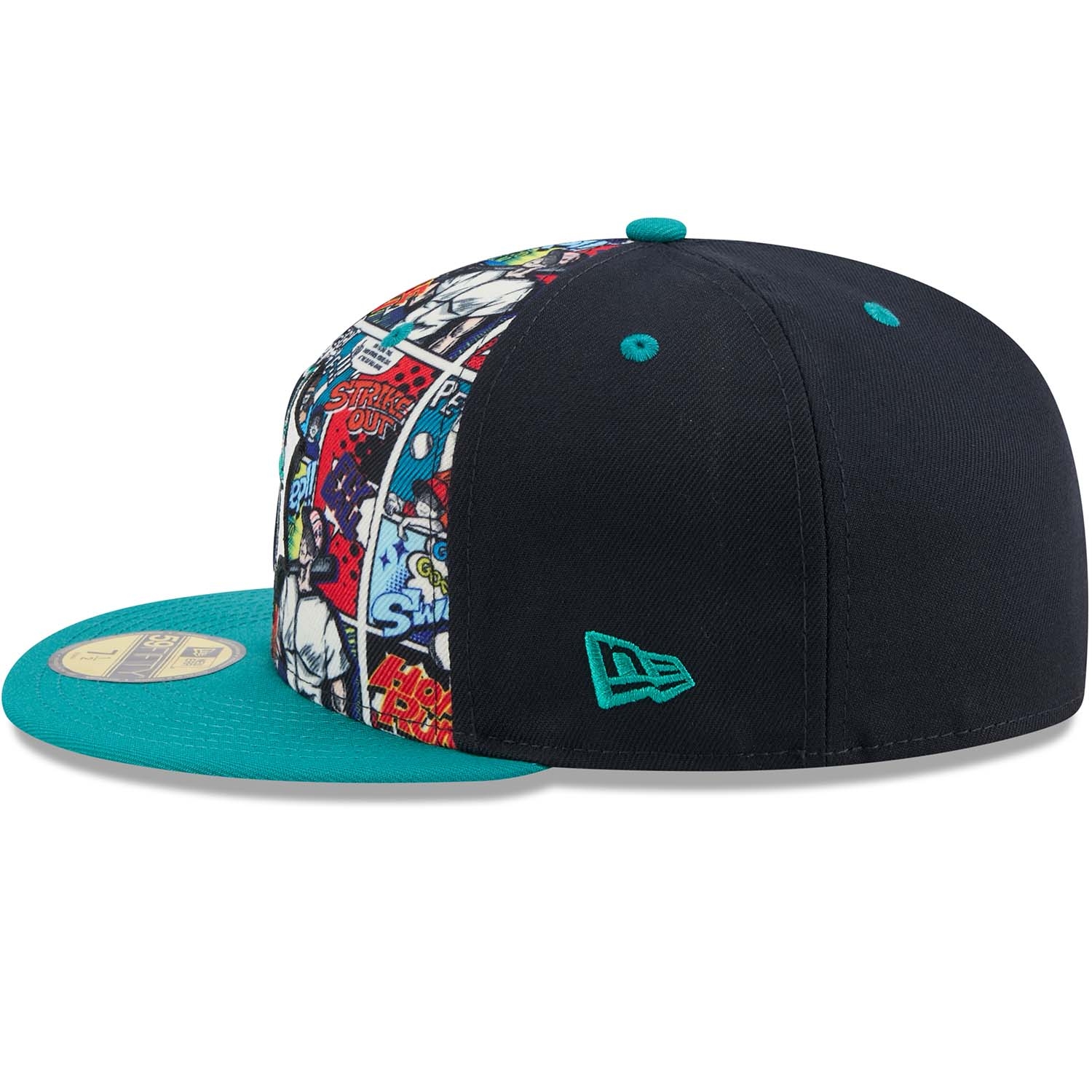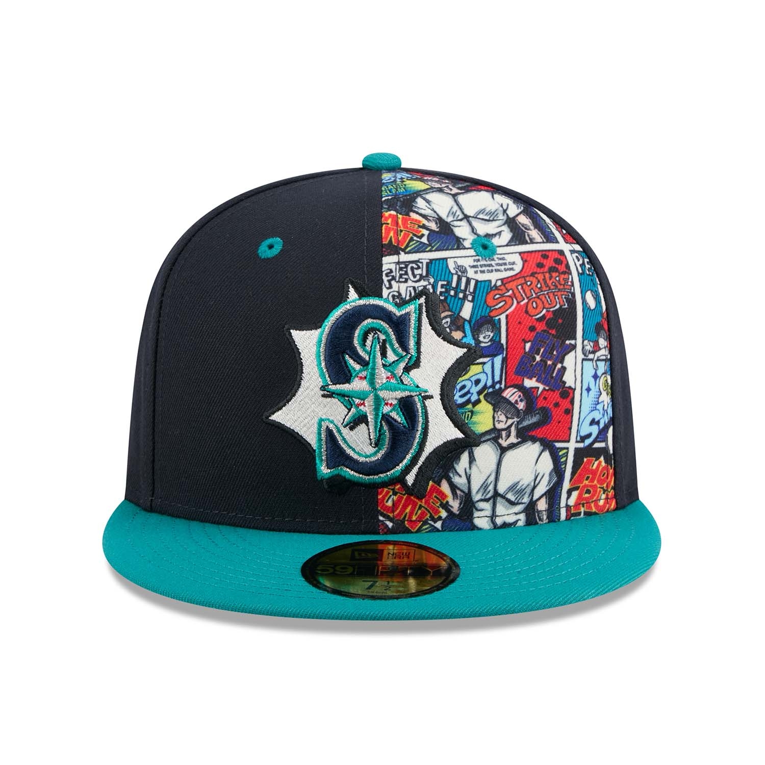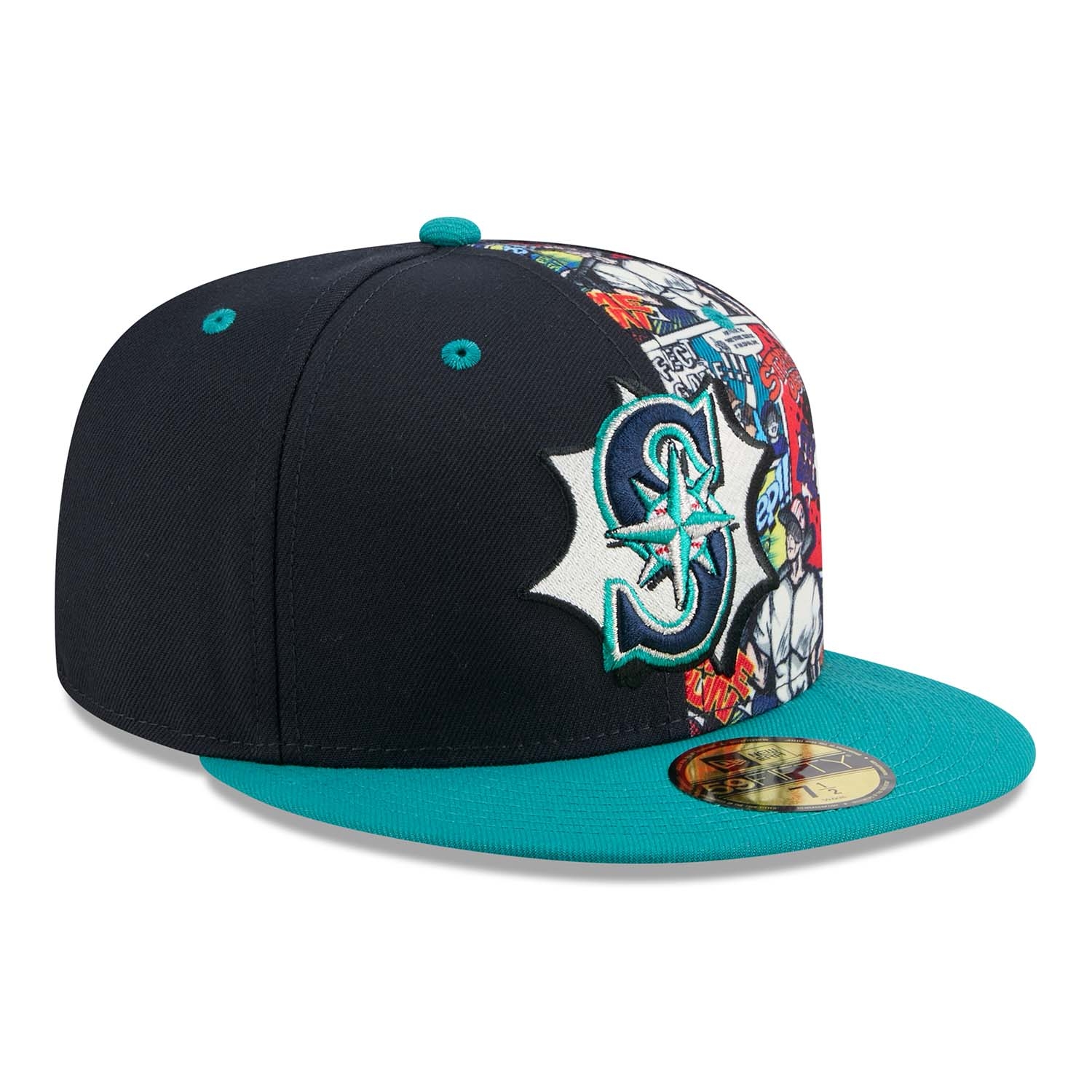 - Seattle Mariners Logo in 3D-Stick auf der Front - platziert auf einem kontrastreichen Allover-Comic-Print im Stil klassischer Graphic Novels.