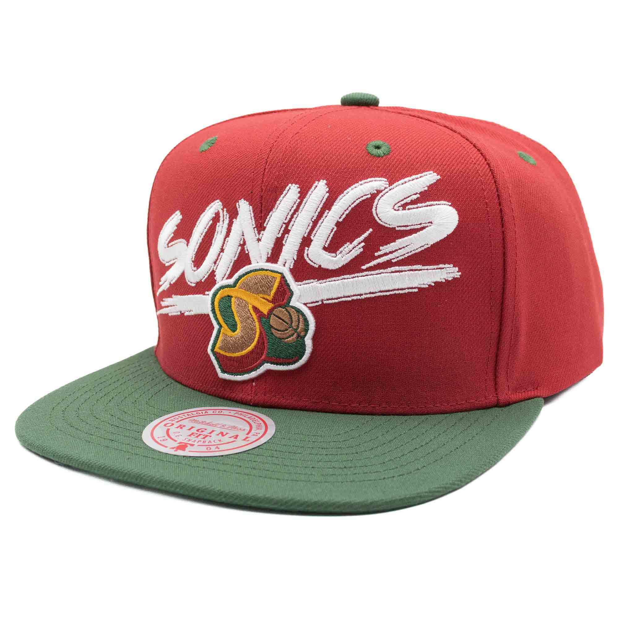 Mitchell & Ness NBA Original Fit Basketball Snapback Cap von deinen Seattle Supersonics im zweifarbigen Transcript Style.