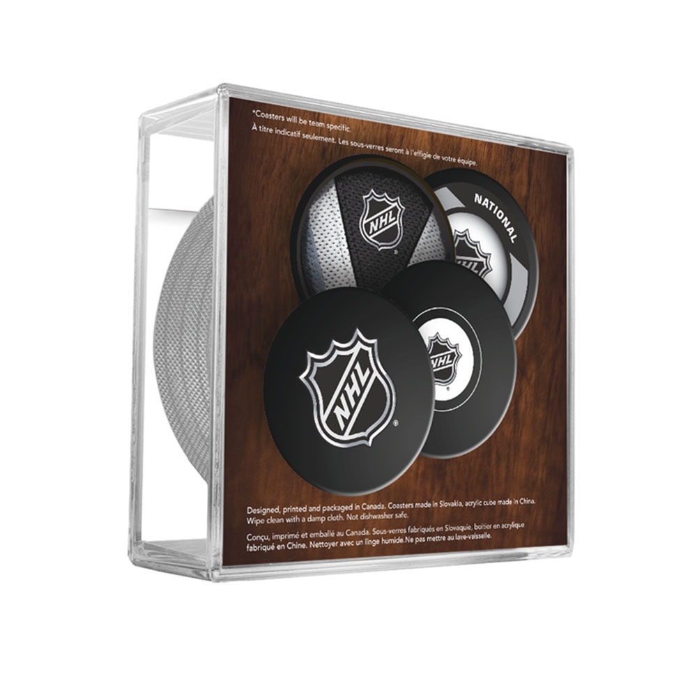 Das Untersetzer-Set besteht aus vier Puck-Scheiben, jeweils mit unterschiedlichen Blues Logos bedruckt. Die vier einzelnen Untersetzer-Scheiben sind aus einem NHL-Puck in Originalgröße geschnitten.