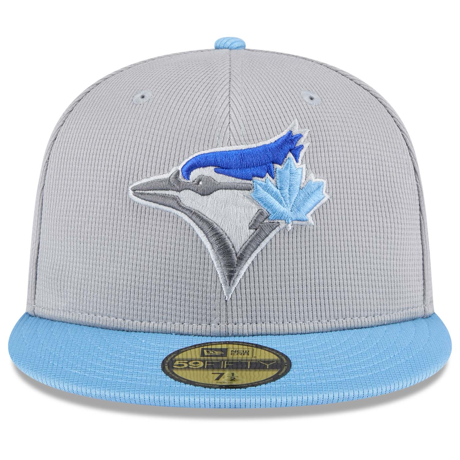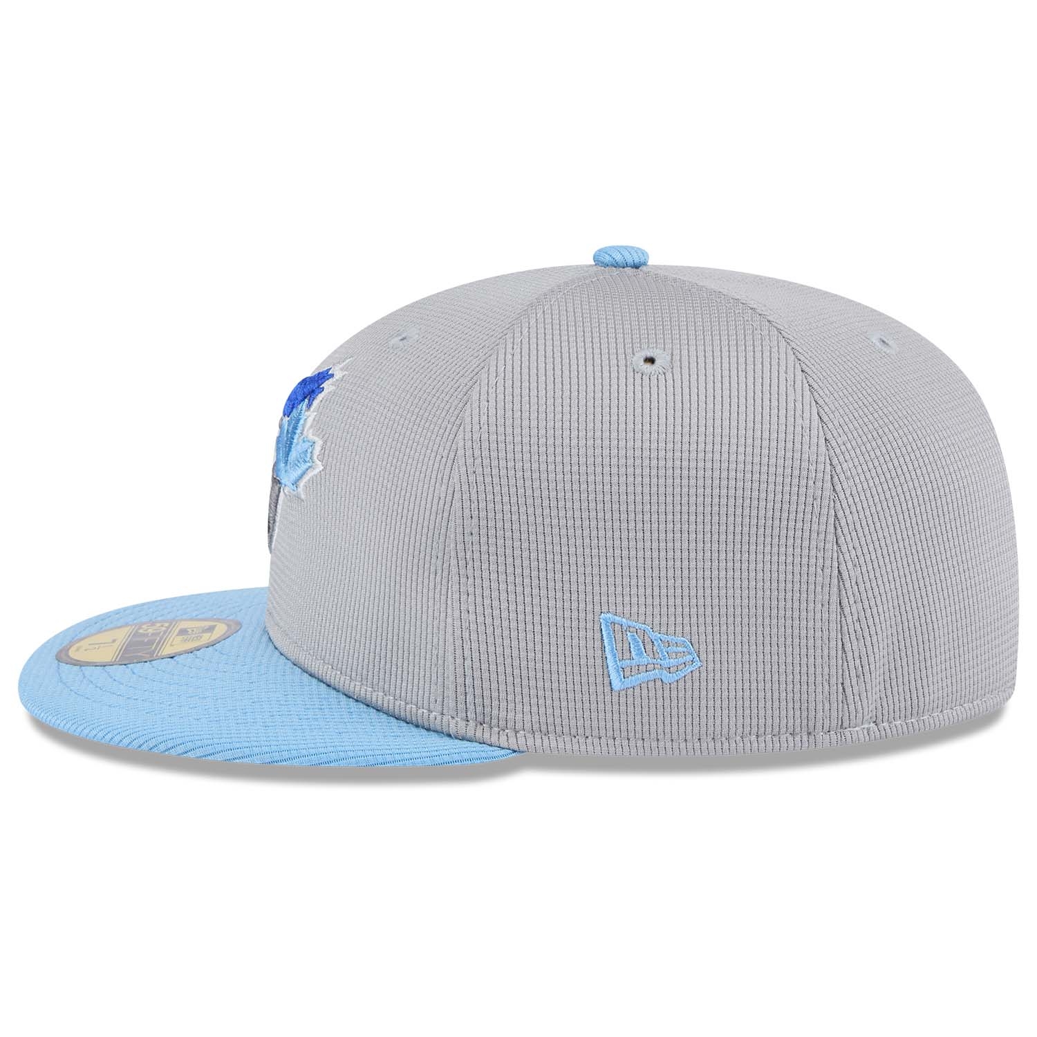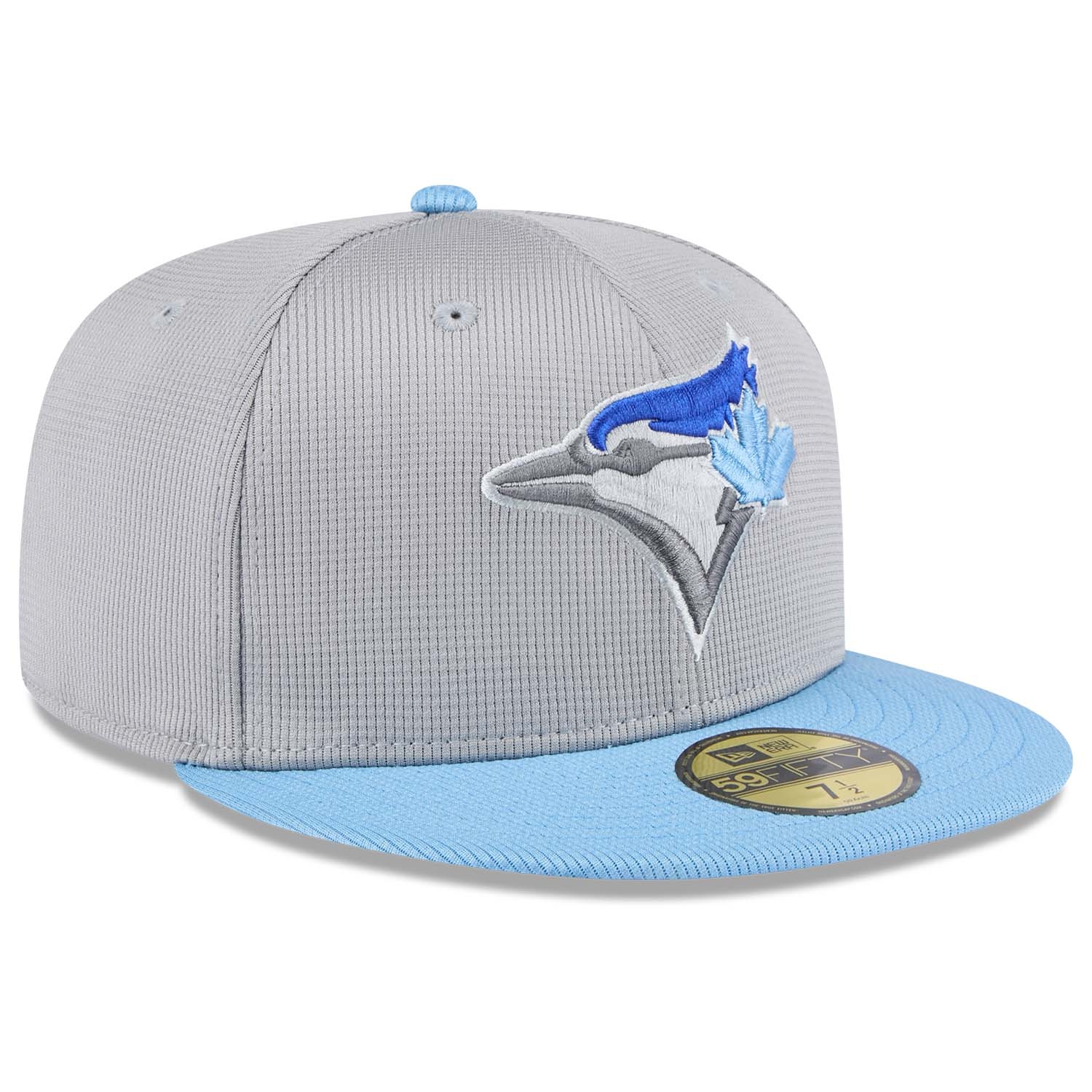 New Era Fitted Baseball Cap von deinen Toronto Blue Jays im 59FIFTY Style aus der grauen Colorway 2025 MLB Batting Practice Kollektion.