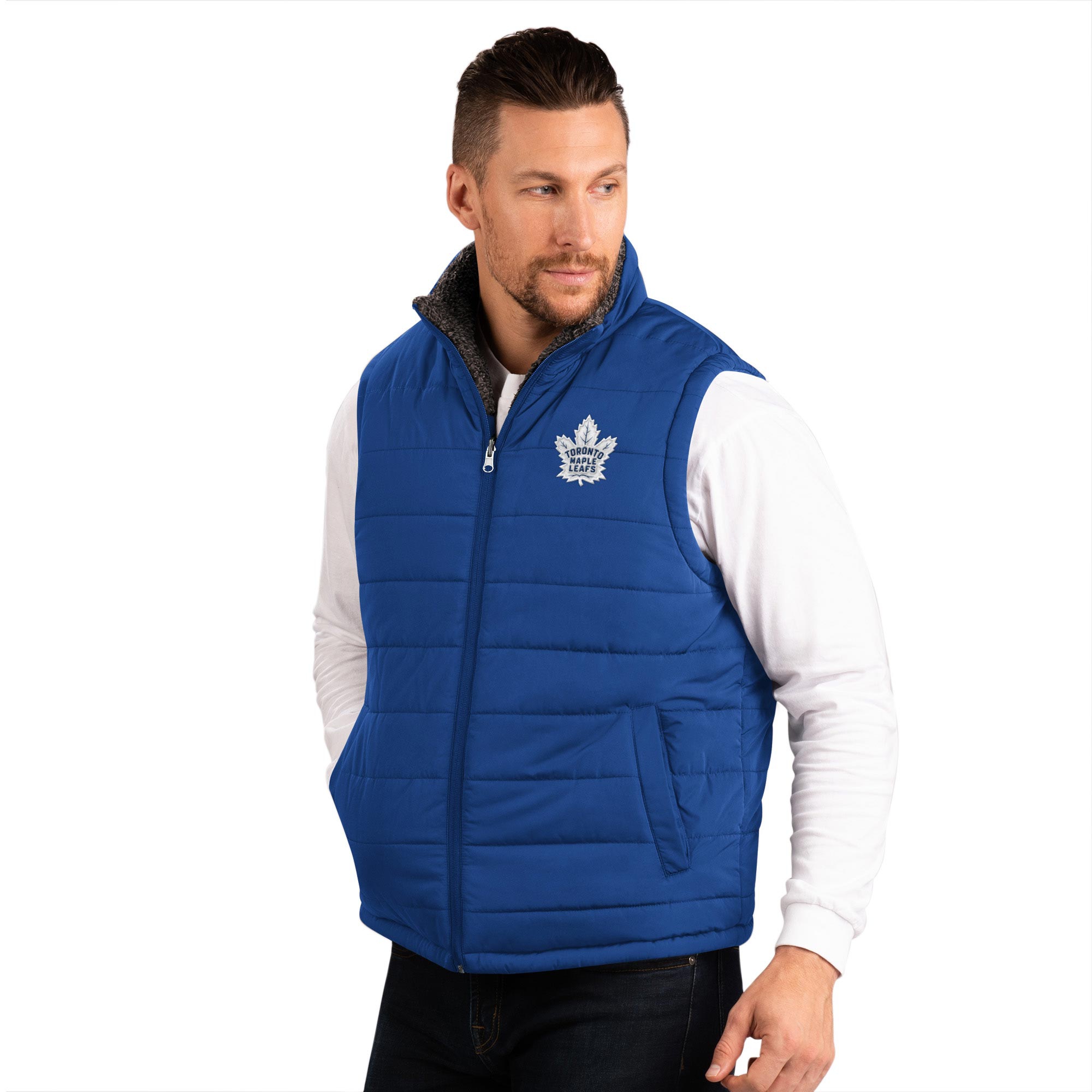 G-III Sports by Carl Banks NHL Herren beidseitig tragbare Reversible Winter Weste im flauschigen Sherpa Power Hitter Look von deinen Toronto Maple Leafs.