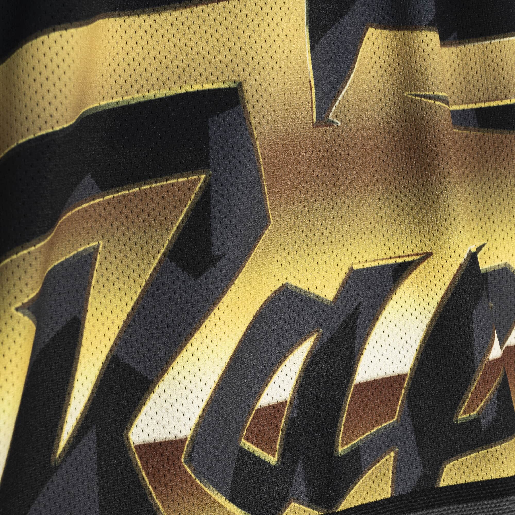 Die vierte Auflage der beliebten Big Face Kollektion von Mitchell and Ness kommt mit dem Gold-Status. Die schwarzen Shorts sind auf der Vorderseite mit den übergroßen Toronto Raptors Wordmark in Gold dekoriert, dunkelgraue Schatten der Schriftzüge sorgen für den besonderen Look. Die klassischen NBA Shorts bestehen aus doppeltseitigen Polyester-Mesh und stehen den bekannten Mitchell & Ness Swingman Shorts in Verarbeitung und Style in nichts nach. Die seitlichen Taschen und der elastische Hosenbund mit innerem Kordelzug sorgen für einen angenehmen Tragekomfort. Der extra große Toronto Raptors Schriftzug ist als Sublimationsdruck direkt in den Stoff eingebracht, zusätzlich ist ein kleines Team-Label am inneren Saum angebracht.