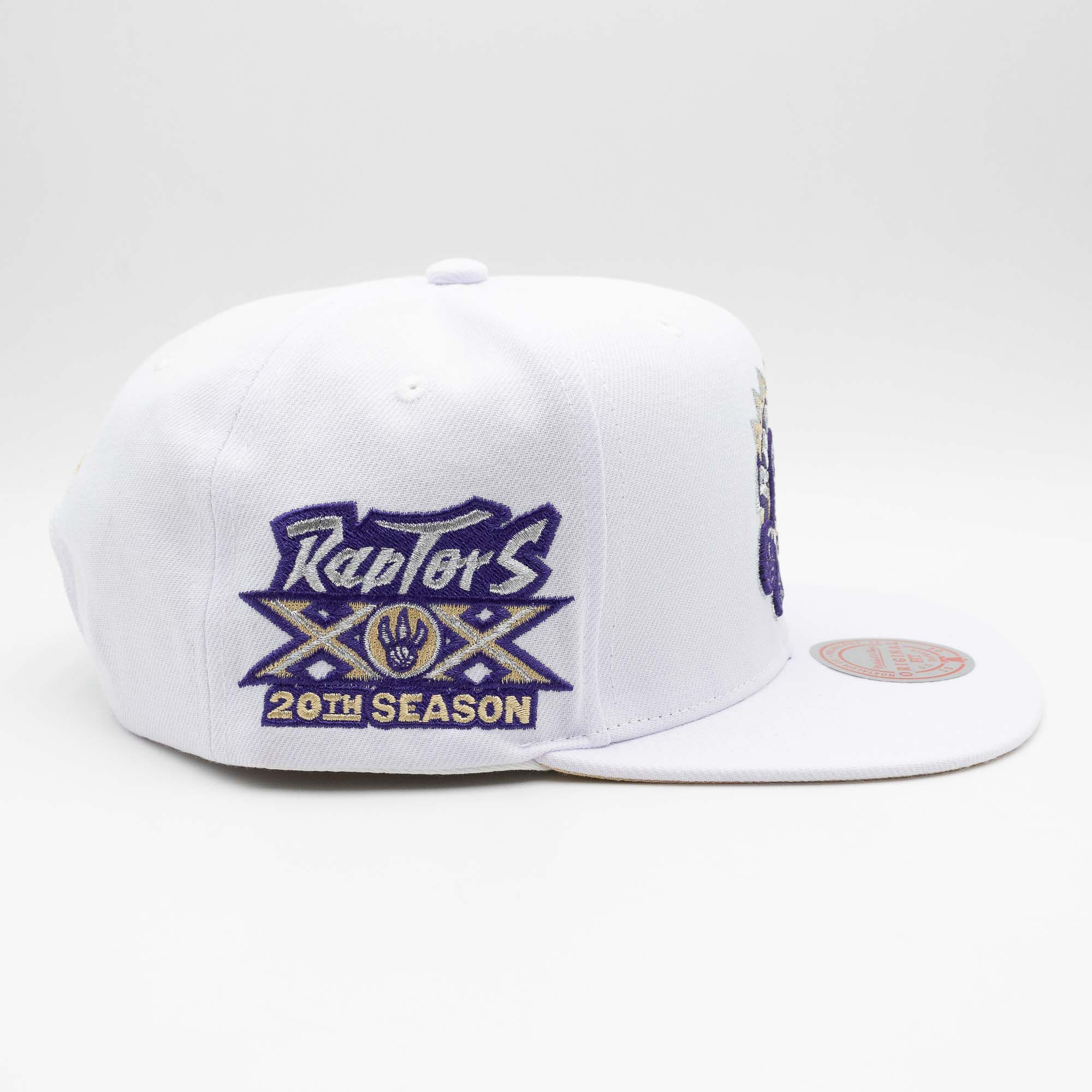 Mitchell & Ness NBA Original Fit Basketball Snapback Cap von deinen Toronto Raptors im weißen Winter White Design mit hochwertig aufgesticktem 20th Season Side Patch.