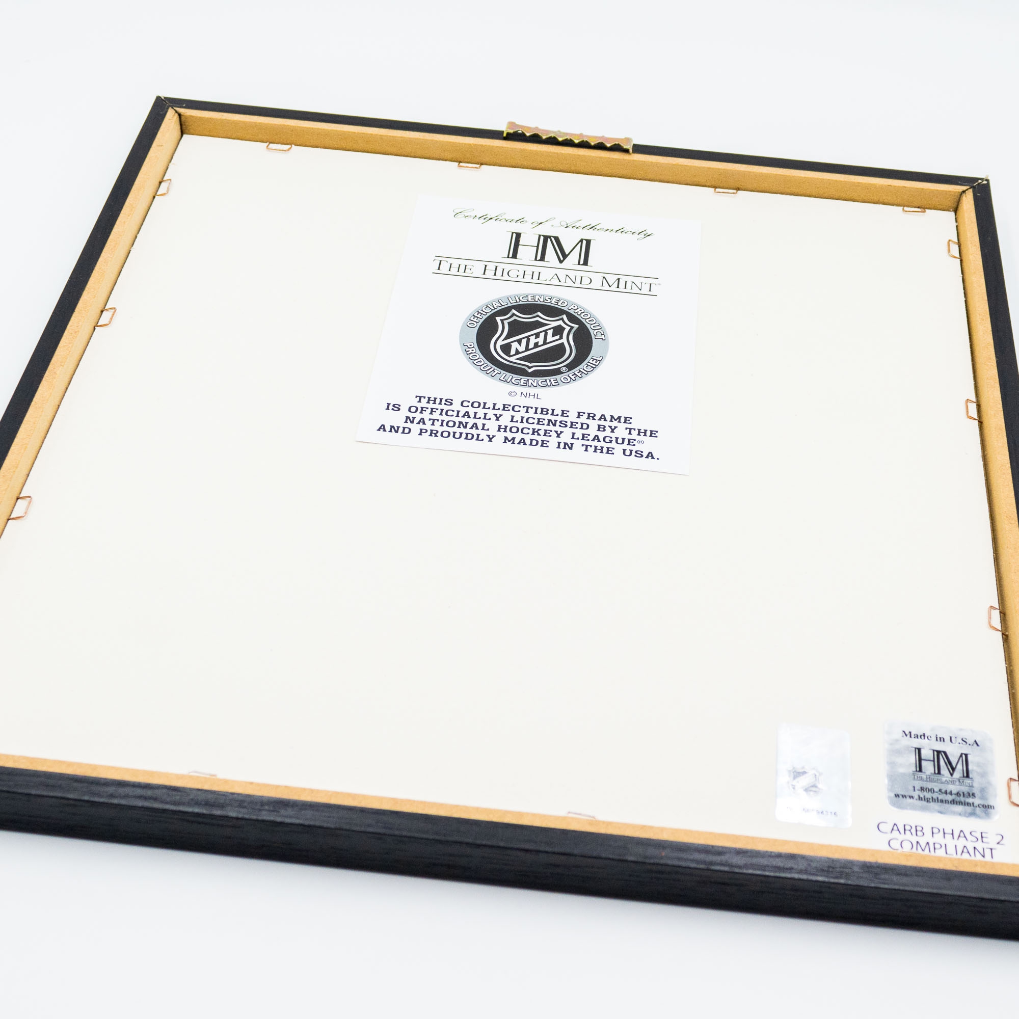 Auf der Rückseite des Bilderrahmes befindet sich das offizielle Echtheitszertifikat. Dieses hochwertige Sammlerstück is offiziell von der NHL & NHLPA lizenziert und wird direkt in den USA von The Highland Mint hergestellt.