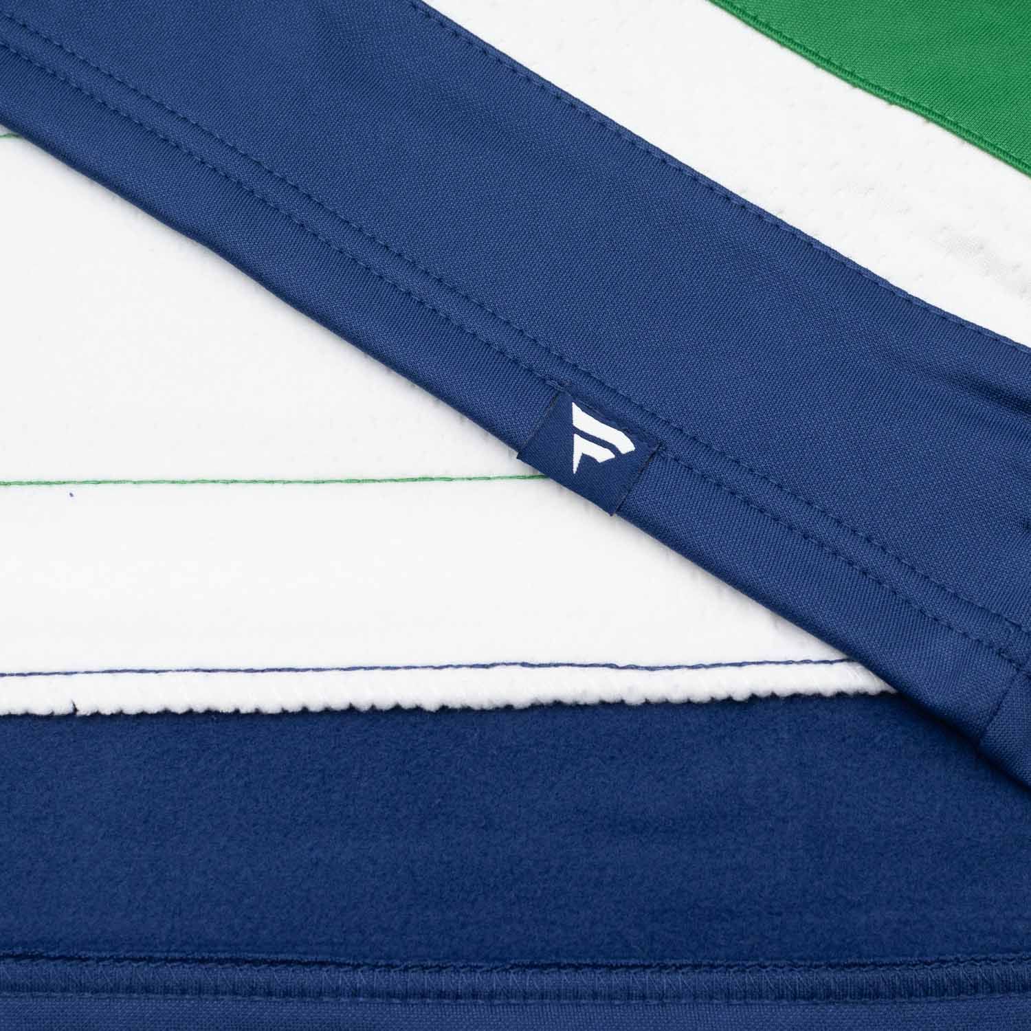 - Aufgenähte Streifen: Authentische, aufgenähte Streifen an Ärmeln und Bund im klassischen NHL-Jersey-Look.