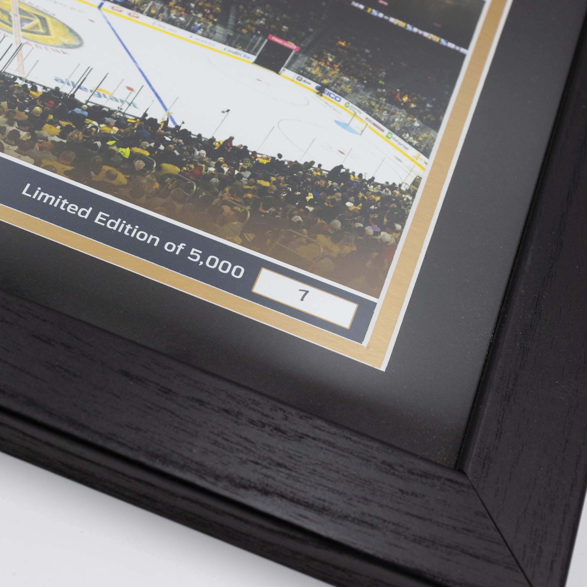 Dieses 33 cm x 40 cm Kunstwerk mit doppelter Mattierung unter einer Glasfrontplatte zeigt ein individuell nummeriertes Foto von deinen Vegas Golden Knights! Das kunstvoll arrangierte Bild zeigt das Vegas Golden Knights Teamlogo vor dem Hintergrund der Eishockey Arena. Zusätzlich wird dieses einmalige Sammlerstück mit einer geprägten 39 mm Team Bronze-Gedenkmünze hervorgehoben. Alle Stanley Cup Championships sind ebenfalls aufgeführt.