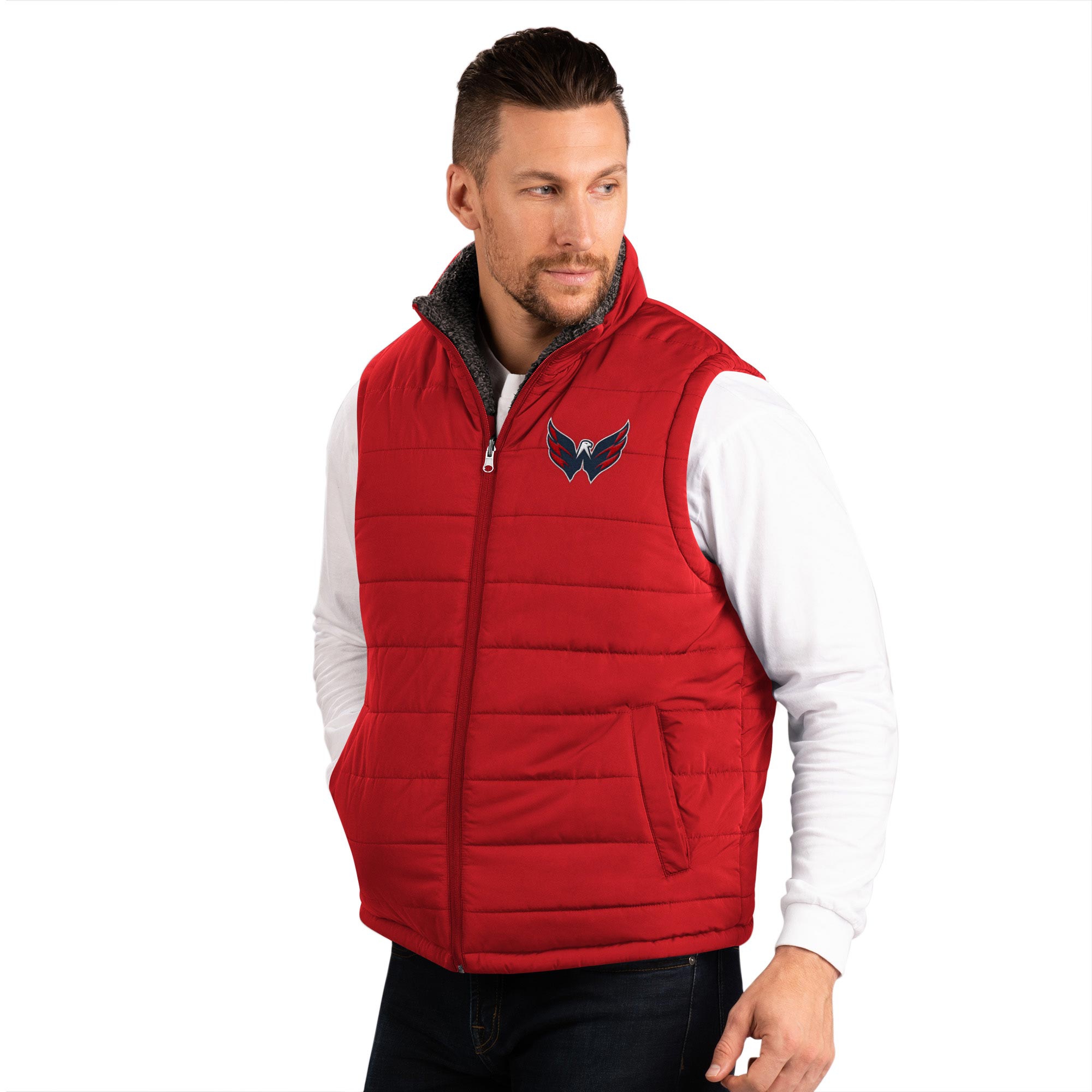 G-III Sports by Carl Banks NHL Herren beidseitig tragbare Reversible Winter Weste im flauschigen Sherpa Power Hitter Look von deinen Washington Capitals.
