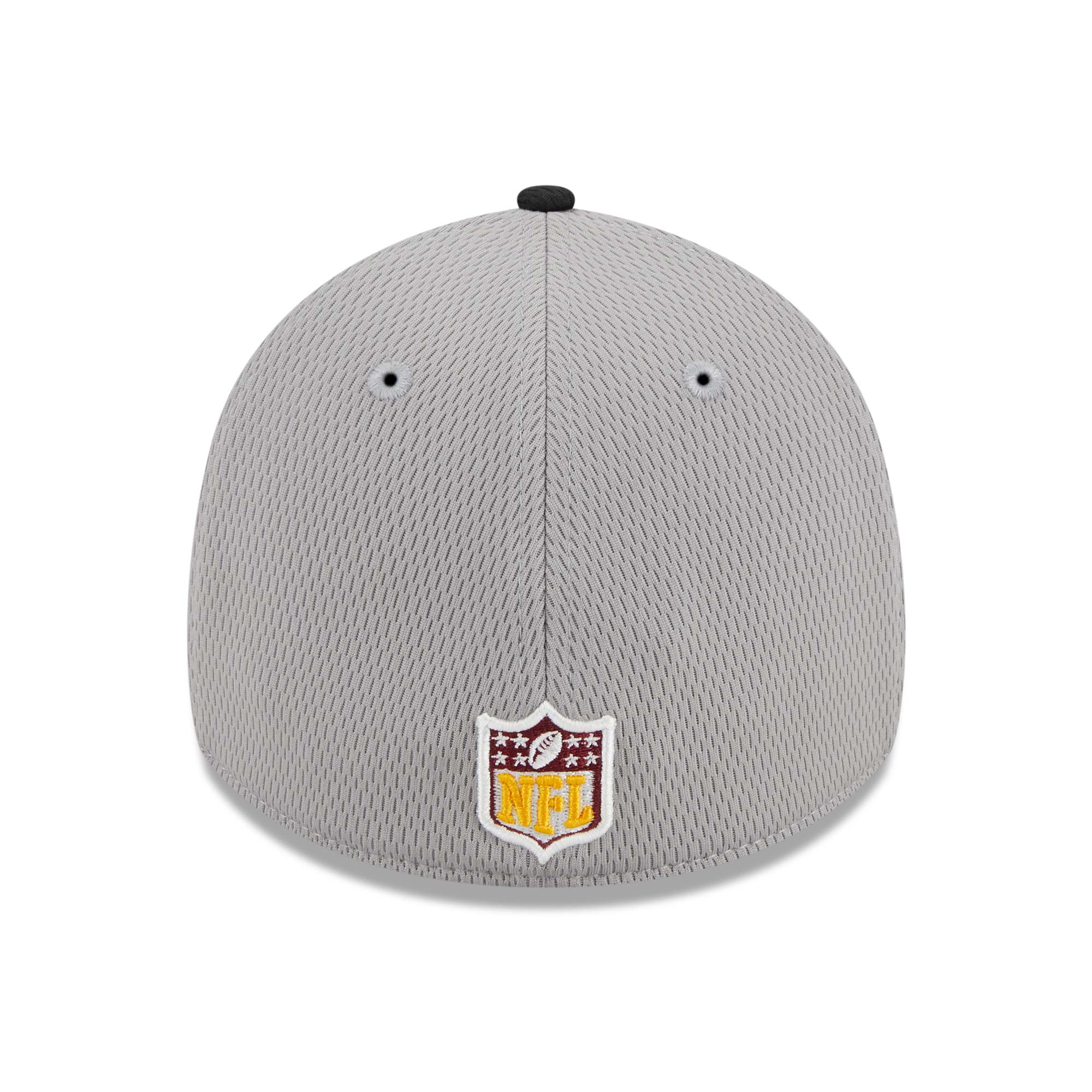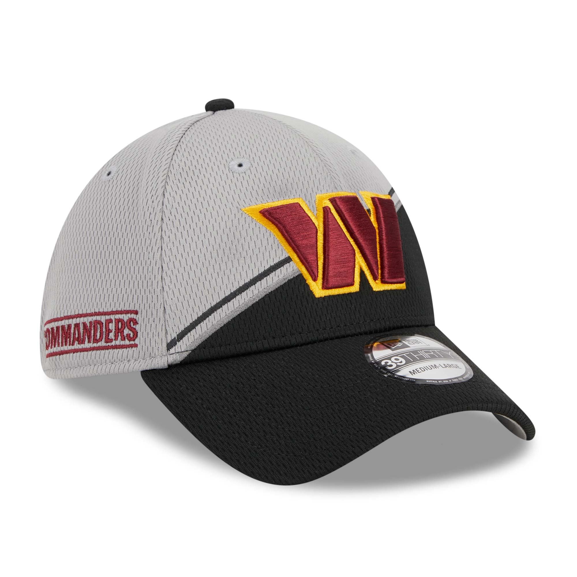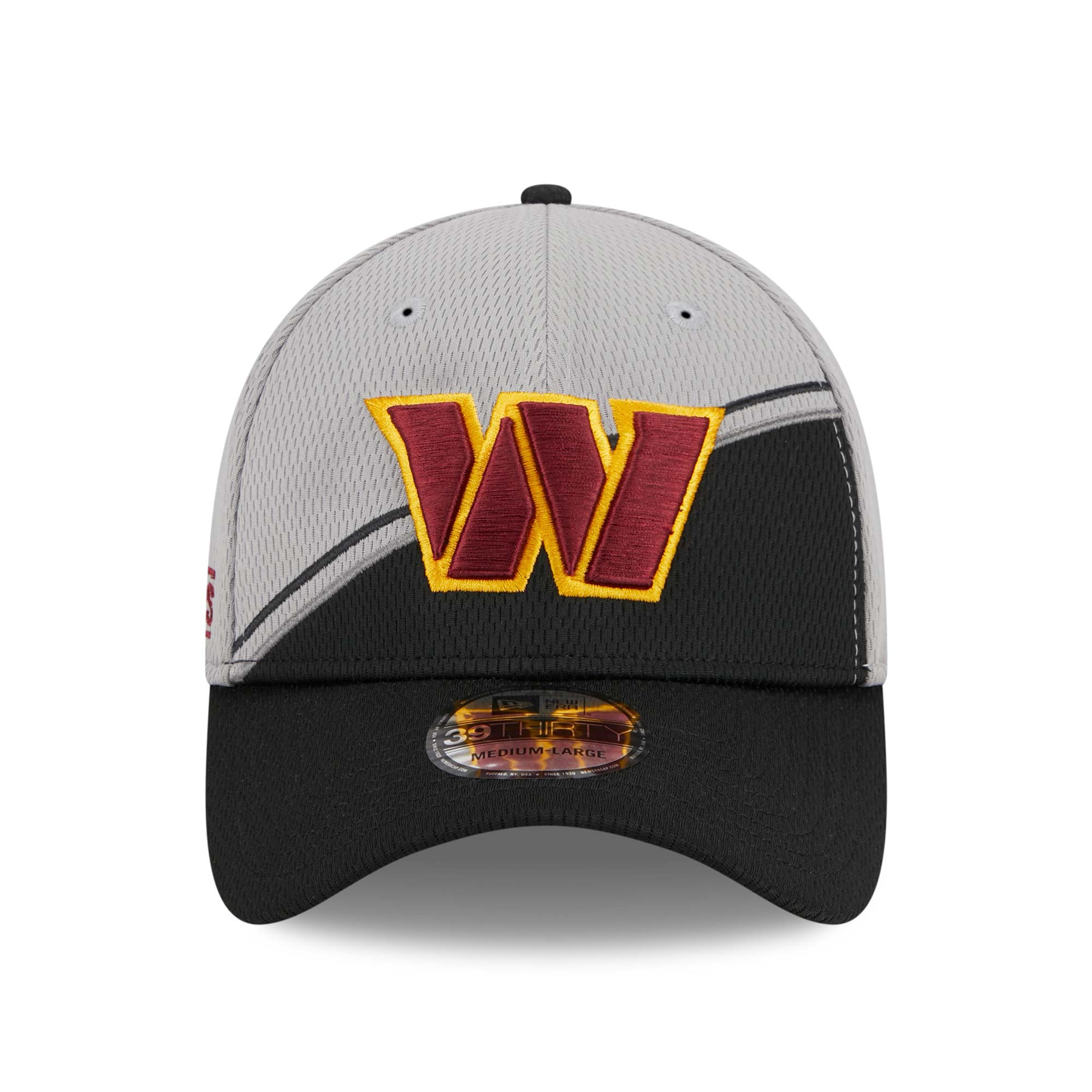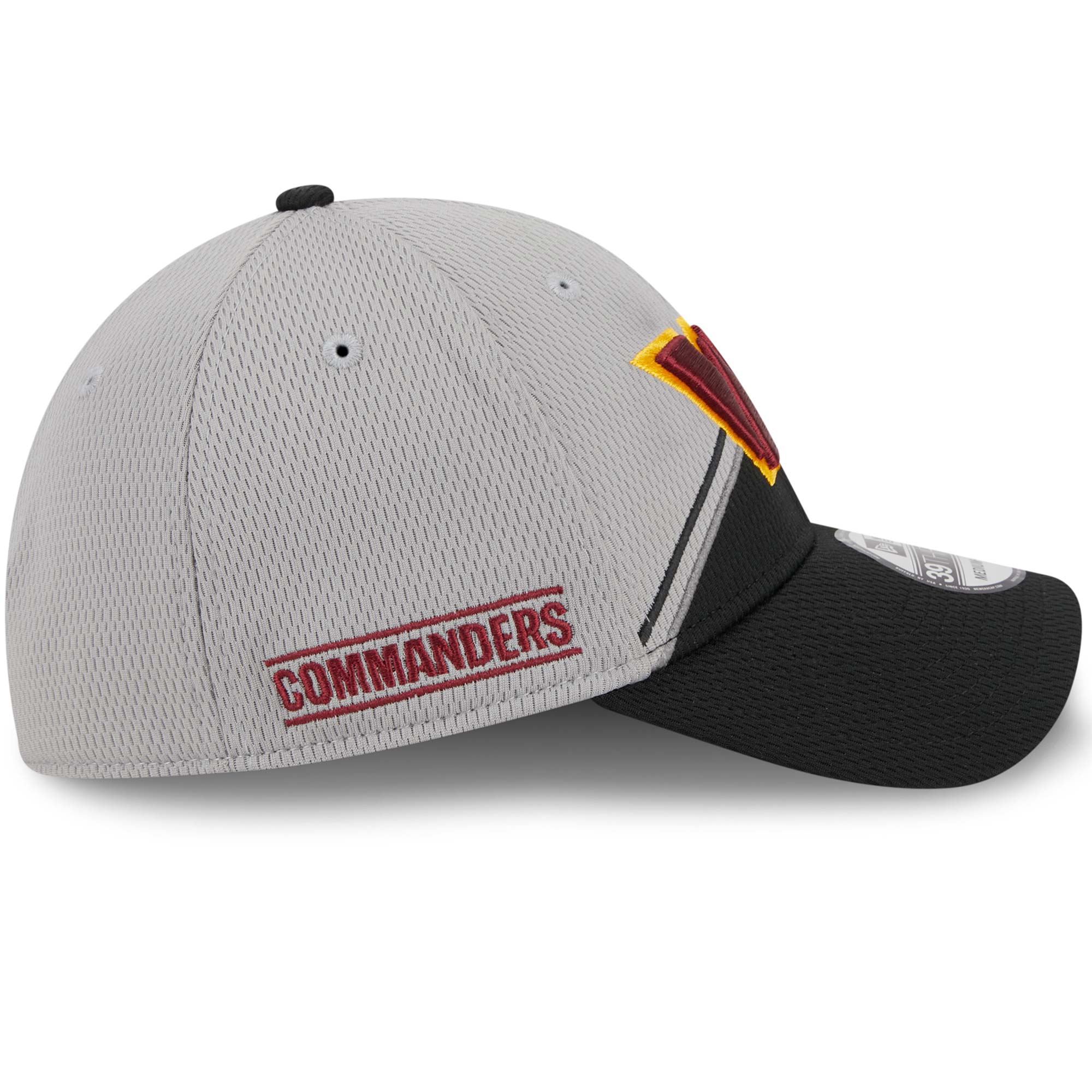 New Era American Football Flex Cap von deinen Washington Commanders im Stretch-Fit 39THIRTY Style aus der schwarz-grauen Colorway 2023 NFL On Field Sideline Kollektion.